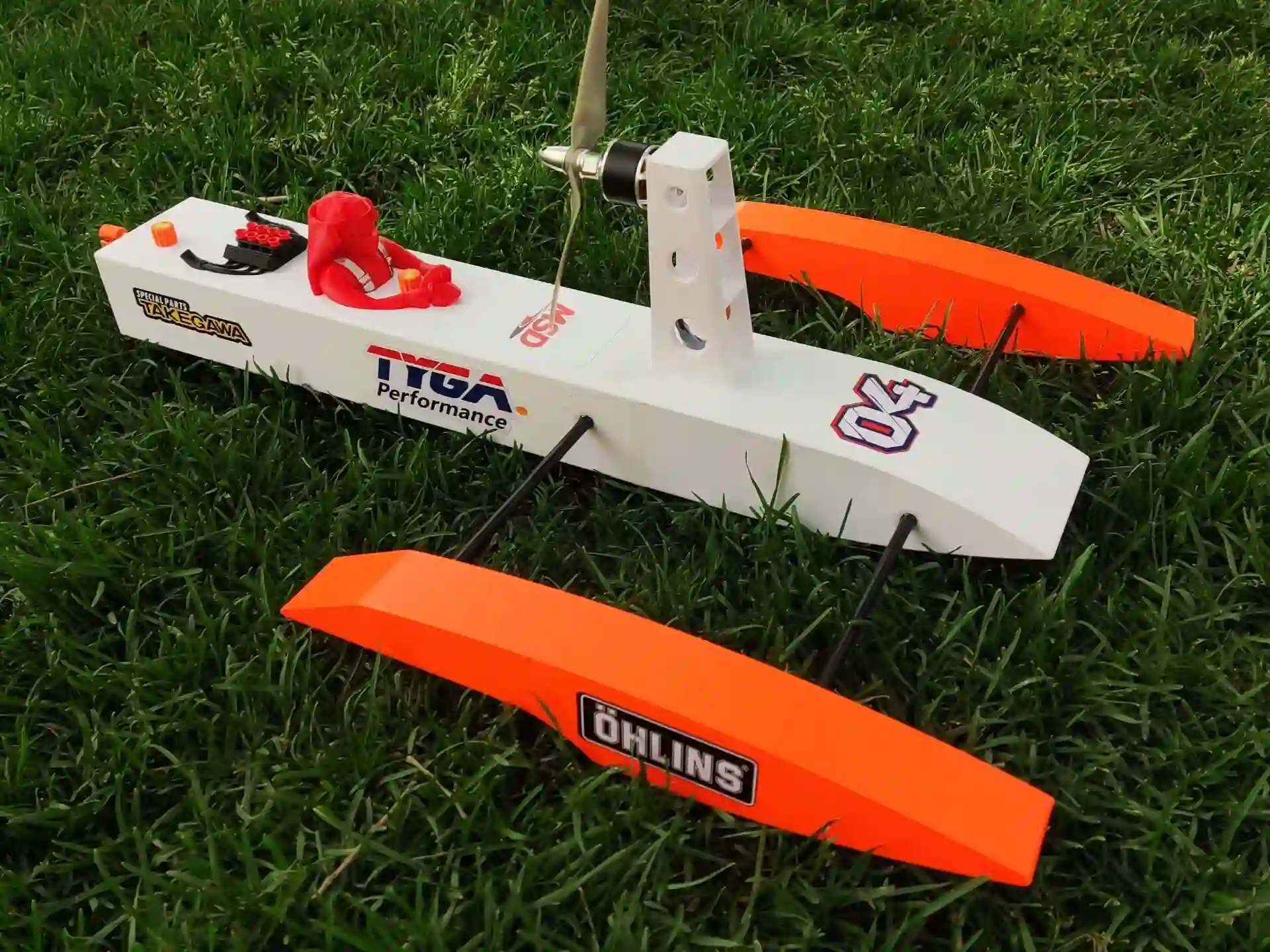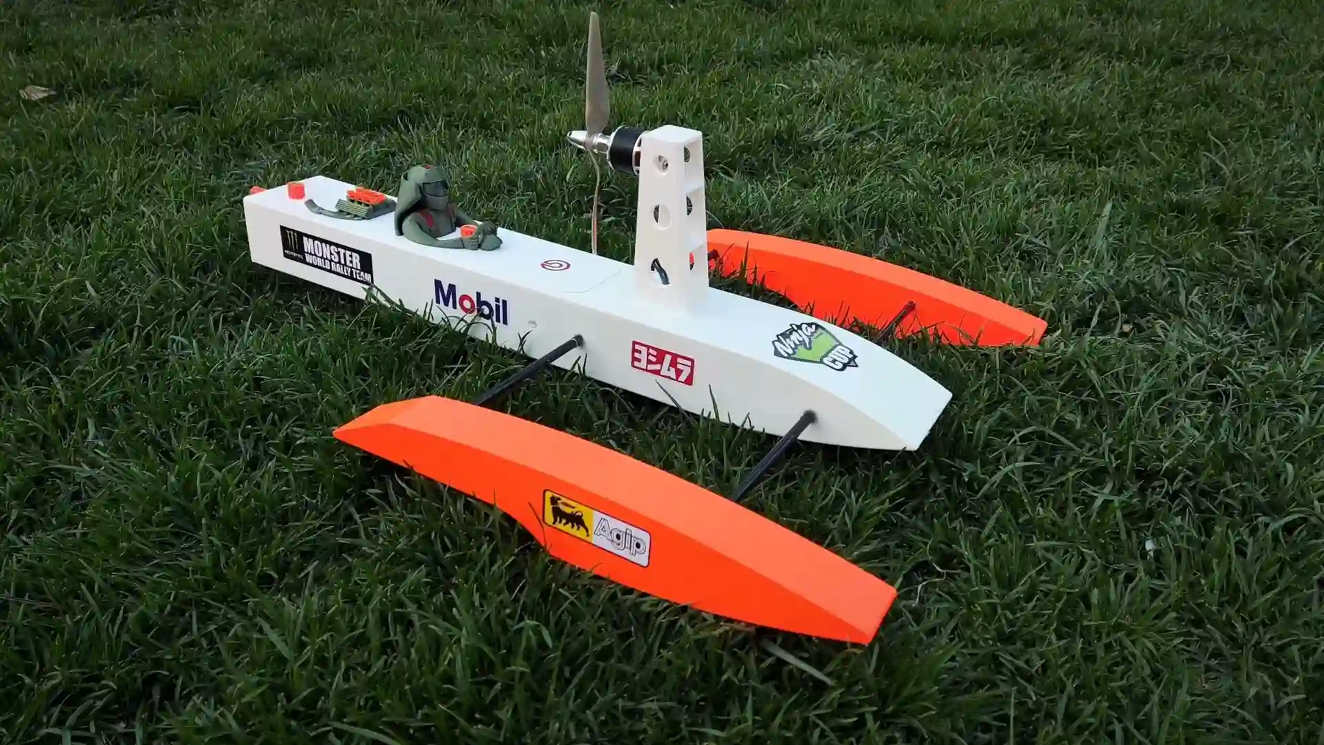 EXCLUSIVE 3D-PRINTED DESIGN: The hull, steering rudder, motor mount, and sponsors (aqua blades) are 3D-printed as integrated parts. Superior strength, modern aesthetics, and a huge time saver over traditional wooden kits.