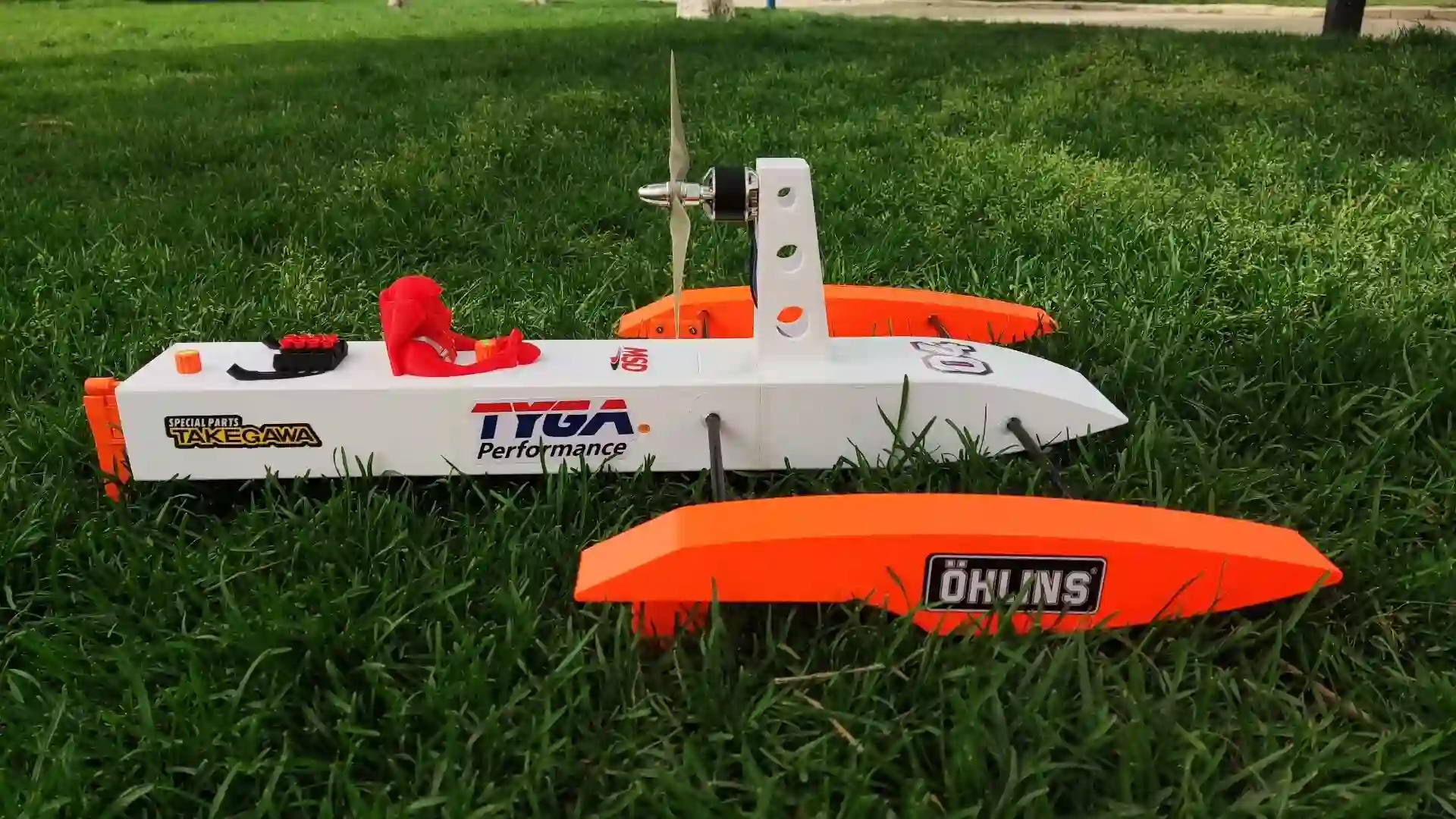 COMPLETE BUILDER’S KIT: Includes 3D-printed hull, carbon fiber tube, rudder, driver/engine decor, all hardware, seals, and water-cooling tubing.